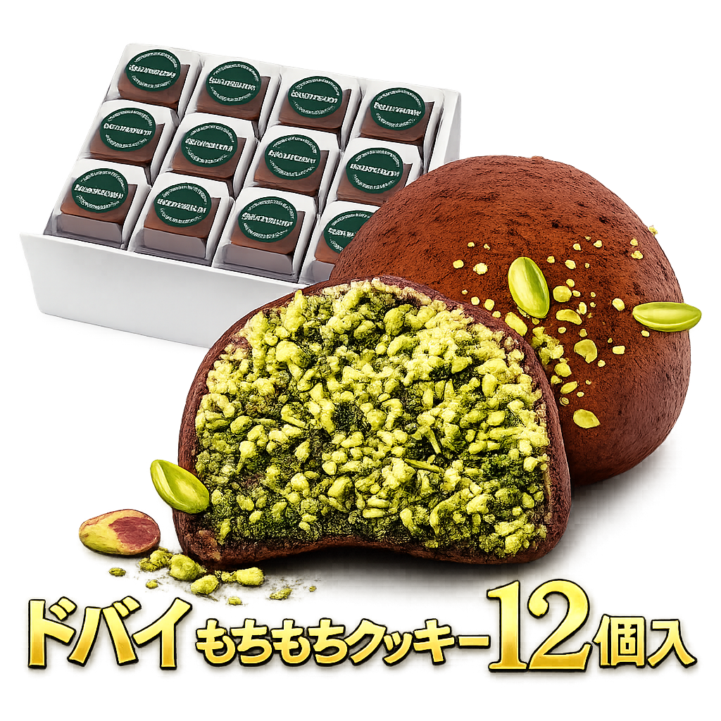 ピスタチオフィリング入りの今SNSで大人気のドバイチョコレート風味を再現したもっちり食感のクッキーです。外はもっちり、中はサクッとした独特の食感が楽しめる新感覚のクッキーで、従来のクッキーとは一味違う美味しさです。